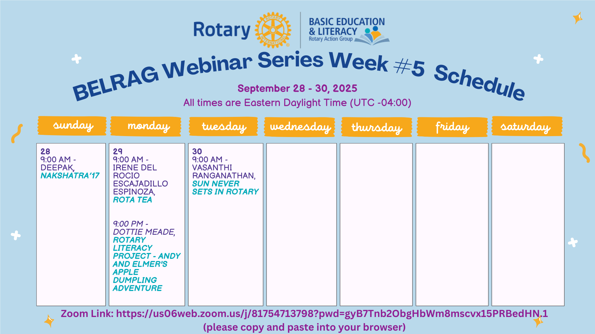 We are in our final week of the “BEL Around the World Webinar Series,” a month-long event designed to highlight education and literacy projects from Rotary members worldwide. Nearly every day, we featured two different 30-minute webinars showcasing active Rotary projects, sharing insights, and discussing impactful strategies for improving basic education and literacy.